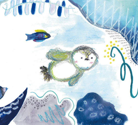 | 阿瓦列何さん | 海に対する恐怖感を色で表現するのが難しかったです。最初は怖い様子を表すために暗い色を使い、徐々に明るい色を増やして恐怖感が無くなる様子を表しました。また、赤ちゃんペンギンのフワフワな毛並みを表現するのも大変でした。苦労とは違うかもしれませんが、「自分なりの居場所はみんなにある」ということを物語の中でどう自然に伝えればいいかを意識しました。 |
