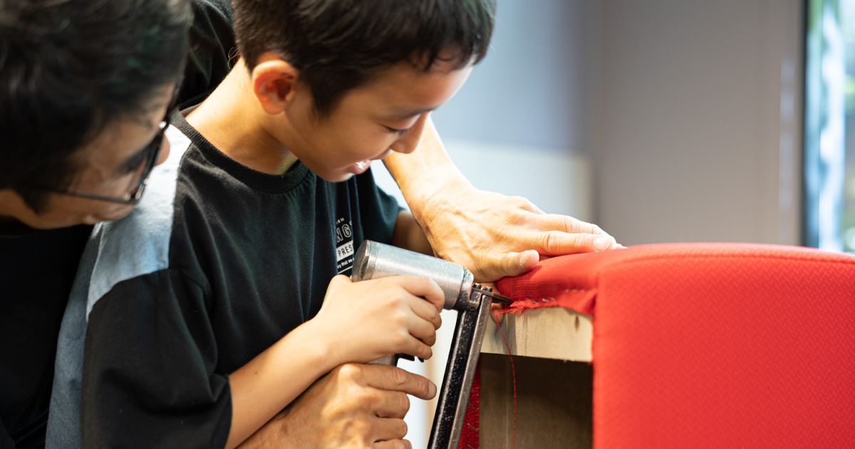 イベントにはHちゃんにご参加いただきました。最初のウレタン接着の工程では、接着剤スプレーの角度に少し苦労されていた様子もございましたが、職人からコツを聞いて徐々に慣れていっておりました。オットマンの木枠とウレタンを接着する際は、お母様がサポートとして作業に加わりながらウレタンを接着し、職人に確認をしながら作業を進めている様子がございました。ウレタンを接着した木枠に生地を張る工程では、タッカーを打つ時の音の大きさに驚く表情もあり最初は慎重に作業されておりましたが、タッカーの作業を終えるころにはスムーズに作業を進められており、お父様とお母様に「上達したね!」と声を掛けられている場面も見られました。