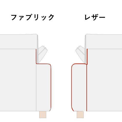 ファブリックとレザーでは、背面のパイピングの仕様が異なります。違いは写真の赤線部分でご確認いただけます。