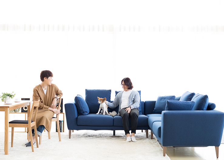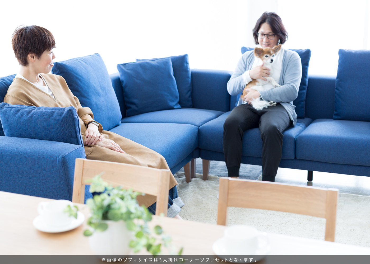 結婚して22年が過ぎ、子供も大きくなりこれからは夫婦のくつろぎの時間を作るアイテムとしてソファを購入検討していました。買い換えに当たり、求めていたことは毎日仕事から帰って疲れている身体を癒してくれるような、くつろぎを与えてくれるソファです。二人同時にゆったりと横になれるようにカウチソファセットが置けたらいいなと思っておりましたが、カウチソファセットの検討は今回が初めてなので実際に配置や見栄え感はどのようになるのだろうという不安がありました。それでも実際に配置して幅2,750mmのサイズ感やお部屋の抜け感がわかりましたし、TVや映画を見たり生活のイメージが湧いて大変良かったです。カバー脱着もしやすいように本体、クッション部ともにファスナー面を広くしている工夫がされていたり、座面高さもひざが余る事なく丁度よくて立ち座りも楽なところも魅力です。ある程度座面高さもあり、座面の奥行きが深いソファを探していたけれど、なかなか見つからなかったですが、夫婦のくつろぎの時間を作るアイテムとして理想のソファに巡り会えました。