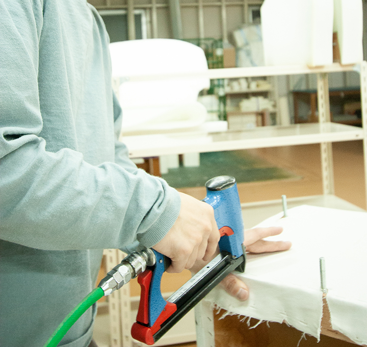 ひとつひとつソファを手作りしているソファ職人、川口さんは子どもの時から物作りが大好きだったようです。「勉強は大嫌いで(笑)やっぱり図工が得意でしたよ。」取材の当日、NOYESのソファの木枠にヌード生地を張られておりました。生地をぴったりと被せてからタッカーで貼り付ける所を現場で見ることができましたが、その一連の流れを集中して創り出していた川口さんの世界はまさに職人の業だなと思いをはせる取材班なのでした。