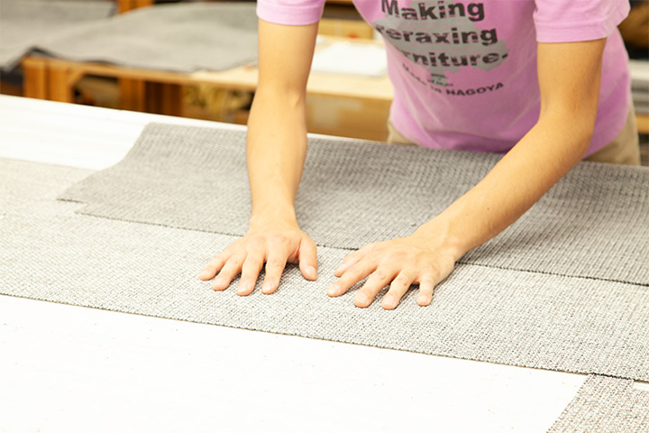 - 裁断する前に生地の反を伸ばしてみるのですが、生地範囲が多いので大変です。気をつけているのは、生地に傷がある場合ですね。製作する上で流れも代わってきますし、ソファに張る部分の生地を調節する必要があり使える生地、使えない生地を見極めることが大事になってきます。