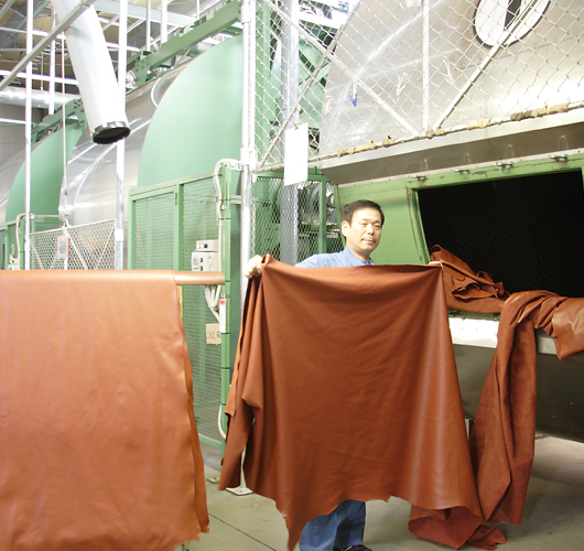 革の表面に塗料を塗ります。刷毛を使って手で塗る場合と、自動的に吹き付けスプレーで塗る場合とあります。塗装の終わった革は、乾燥室へ。