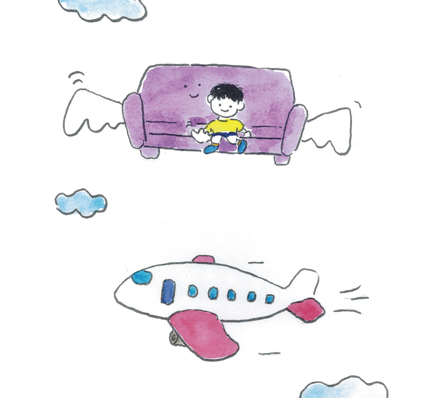 羽がはえたソファで、どこにでかけよう。見てみたかったもの、会いたかった人、頭の中にはたくさんの行き先があることでしょう。主人公のぼくはいったいどこに出かけていくのでしょうか。