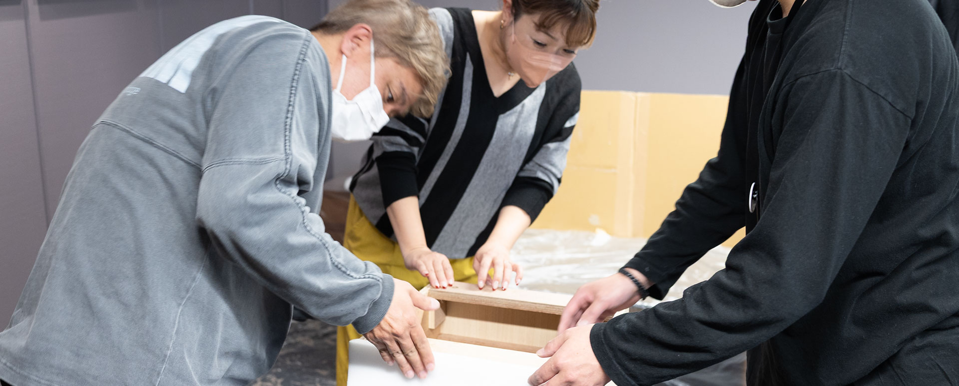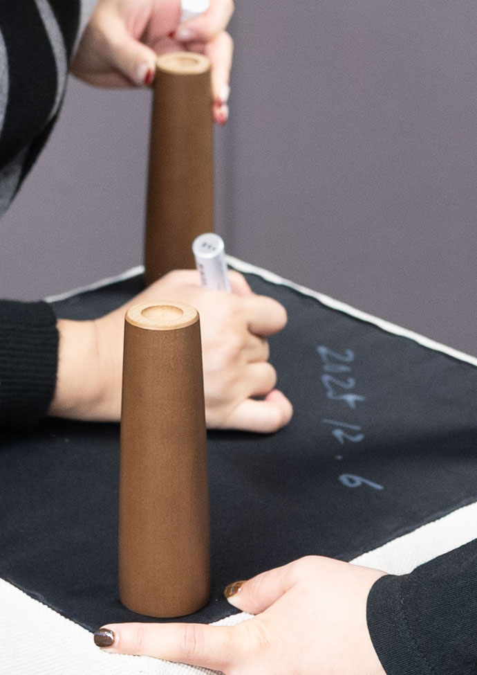M様は特に奥様が「やりたい!」と積極的にご参加いただき、その様子をご主人様が見守っている様子が多くございました。それでも少し力が必要な、生地を木枠に張る工程では、ご主人様が一箇所ずつ奥様と出来栄えを確認しながら作業を進める様子も伺うことができ、お二人が仲良く作業されていました。
