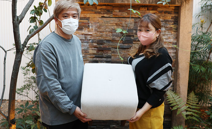 完成後に、世界でたったひとつだけの特別なオットマンと一緒に記念撮影をさせていただきました。ご夫婦が仲睦まじく、楽しそうに作業されている姿を拝見し、スタッフ一同も大変幸せな時間を過ごさせていただきました。