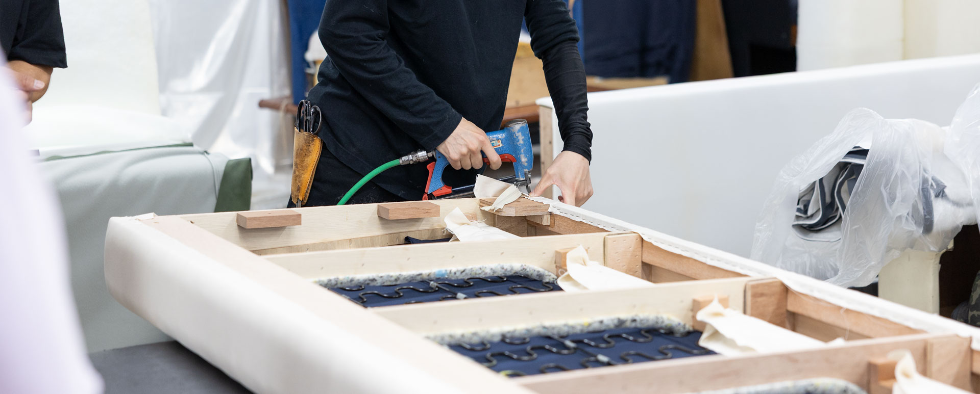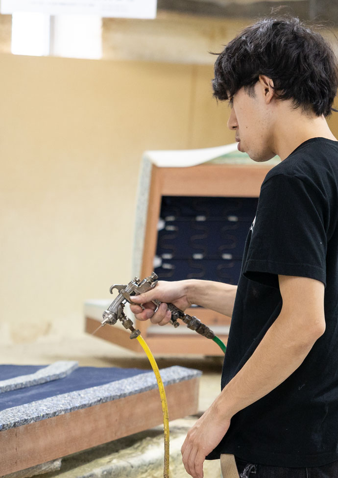 続いてはウレタンをソファの木枠に接着する工程です。この工程では職人が木枠とウレタンに接着剤を吹きかけ、接着する様子を見学いただきました。職人の作業の様子をじっと見つめている姿がございました。