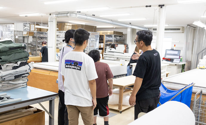 説明の後、職人の案内で工場見学へ向かいました。最初は生地を裁断する工程で、生地を自動で裁断する様子を見学いただきました。機械の裁断の動きに合わせて目で追っている姿がとても印象的でした。