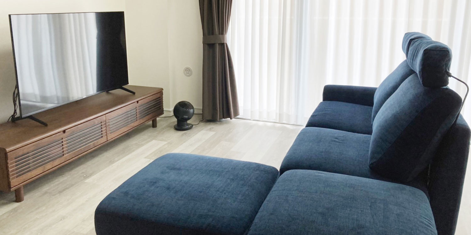 ひじ置きのある側面を窓とは反対側に配置することで、テレビ前の空間とそれ以外の空間の間仕切りのような存在になります。