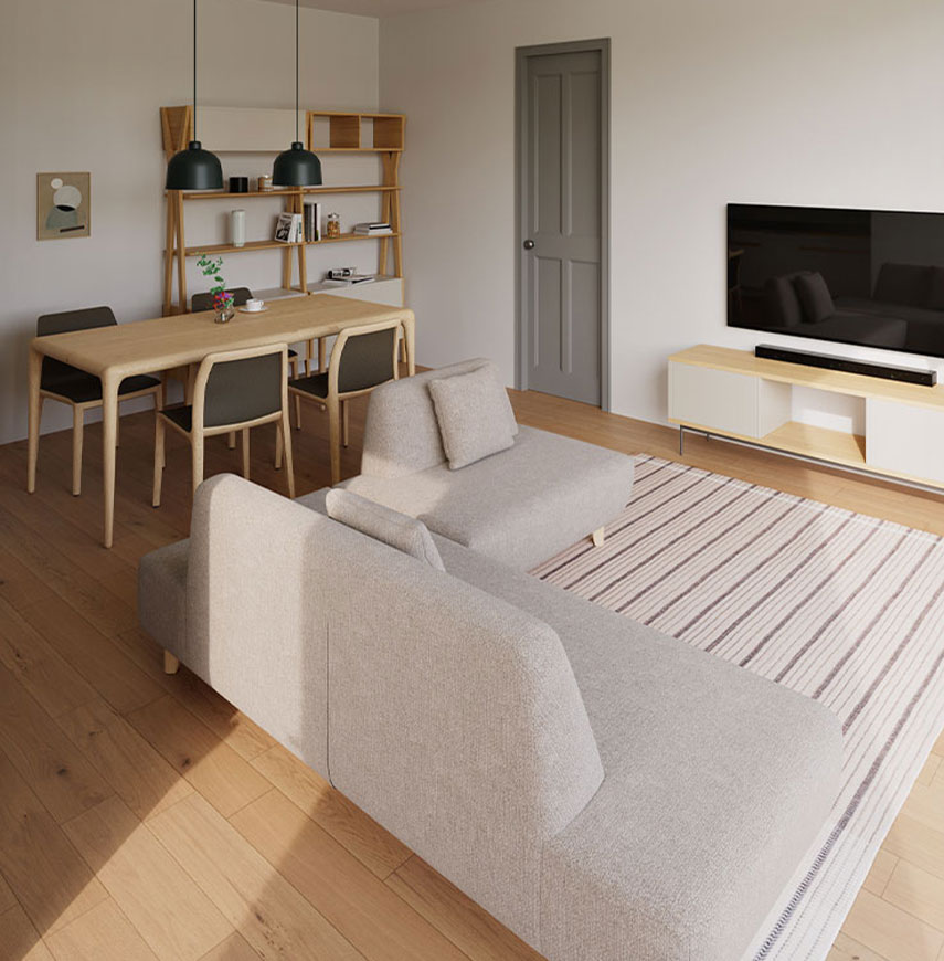お部屋の空間に繋がりをもたらす意匠と利便性はご家族で楽しい空間を作れる喜び、ソファでくつろぐ楽しさを生み出します。