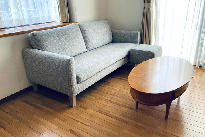 ショールームで生地に一目惚れしました。ソファは現物がなかったので、届くまで不安だったのですが、想像以上にマッチして、見るたびにニヤニヤしています。