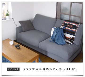 愛用して感じたことは、コンパクトであるが、以外と大きい。とくに3人がけは、肘置きクッションを外していると、とてもゆったりとしていて、存在感も程よい収まりとなります。レイアウトしたお部屋があまり大きくないということもあるが、やはりソファが入ると、お部屋のまとまり感というか、お部屋がいよいよ完成した感がとくかく良い。もちろん、くつろぐ場所が出来ることはなにより特別に良く、 一見、ソファが入ると手狭になるという概念は取り払ってしまうほどです。本来は適正な生活導線をしっかりとることが、無理のない生活になりますので、そこは上手にお客様へ伝えなきゃと思います、、、。