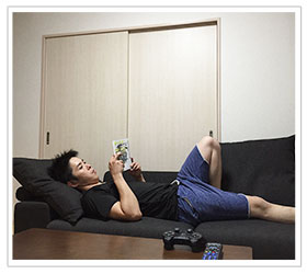 我が家はキッチンルームと六畳のリビングという典型的な1人暮らしの間取り。自分の好きなものが これでもか! と詰め込まれた、完全なる趣味の部屋と化しています。超がつくインドアで、広い空間とスペースが苦手な僕にとっては実に実用的かつ快適な部屋となっています。本棚の隣でゆっくり読書、DVDを観ながらゴロンと横になり、足を伸ばしたい時はオットマンにもなりと非常に万能。この贅沢なゆったり感と存在感が我が家には必要なんです。ウチには猫もいるんですが、ソファの上で遊び、転がり、寝てます。生地SAシリーズは一見ペットを飼っている家には不向きに見えますが、非常に丈夫で、多少ネコがガリガリしても大丈夫なんですね。昼間仕事でいない僕以上に猫がソファを満喫してます。