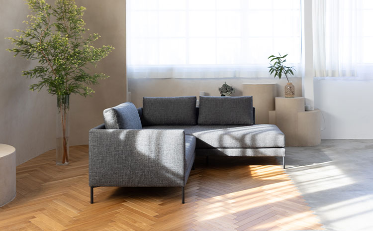 カウチソファセットは、3人掛けカウチソファセット(1910mm × 1790mm)と2人掛けカウチソファセット(1910mm × 1590mm)の2サイズ展開。いずれもコンパクトな寸法ながら、都市部の住宅事情に合わせて使いやすく設計されています。正方形に近いプロポーションのため、LDKの限られたスペースでもすっきりと収まりやすいのが特徴です。マンションのリビングでは、ソファが実質正方形に近いスペースを占めることが多く、その点に合わせた設計により空間を無駄なく有効活用でき、お部屋が狭く見えにくいという利点があります。
