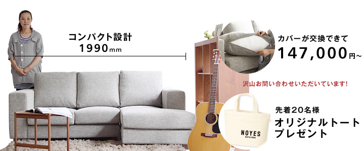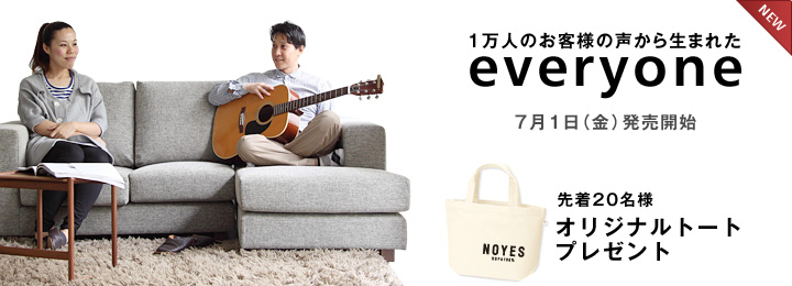 everyoneはカバーが替えられて147,000円〜というとってもお得な価格です。この価格もソファ通の皆さんの投票によって決まりました価格となっています。また、サイズも10畳〜12畳に似合うコンパクトカウチソファというコンセプトに基づいて2メーター以内ギリギリの1990ミリとなっています。このサイズでしたら10畳〜12畳に置いたときにピッタリしっくりくる大きさです。そして、先着20名様にNOYESオリジナルトートをプレゼント!NOYESのオリジナルグッズなだけに絶対に手に入れたいですね。