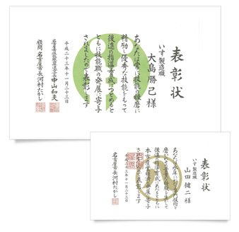 2011年11月、NOYESの職人である「大島勝己」と「山田健二」両名が、その優秀な技能がたたえられ、これまでの功績も評価されたことで名古屋市からそれぞれ表彰を授与いたしました。