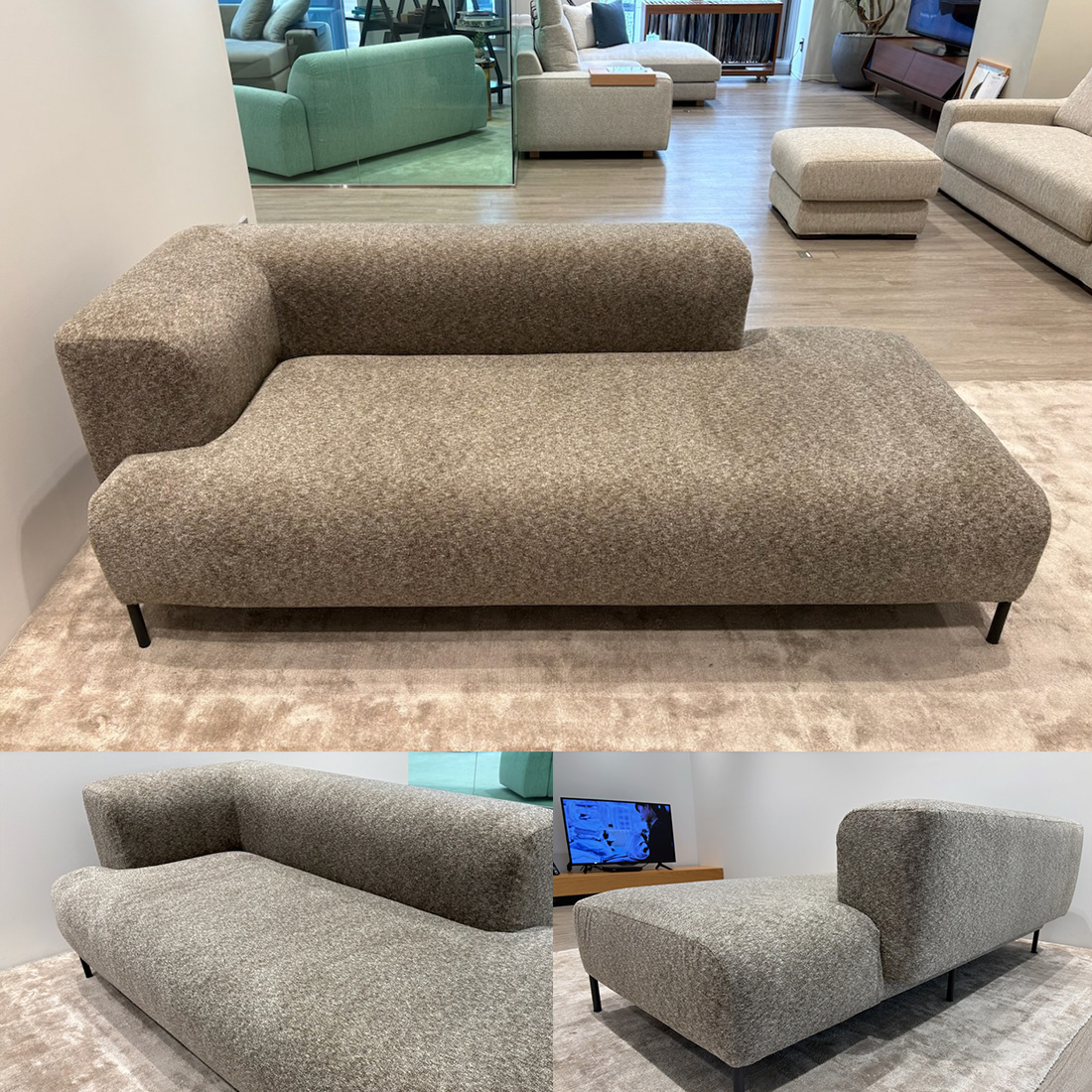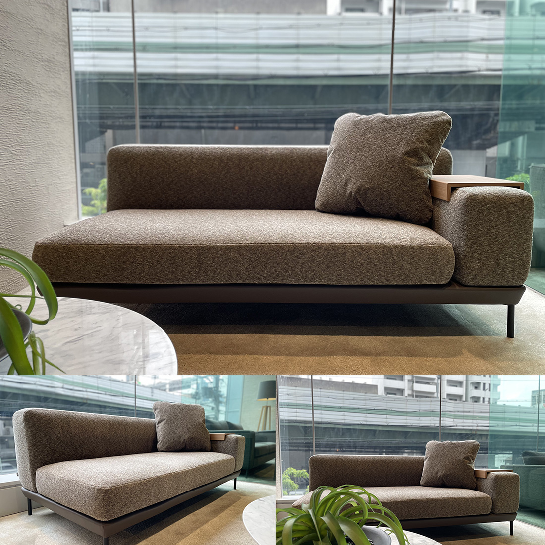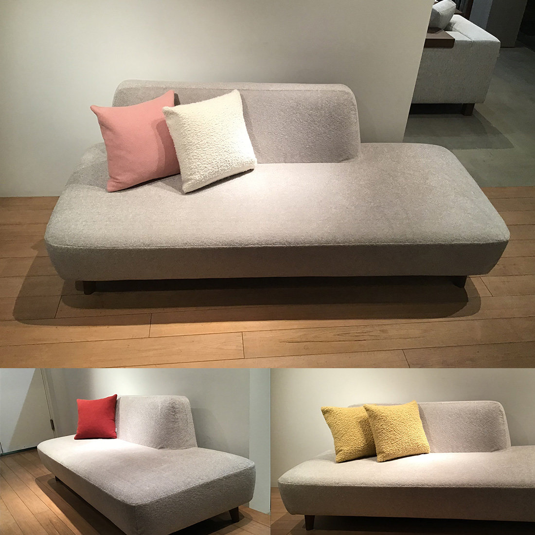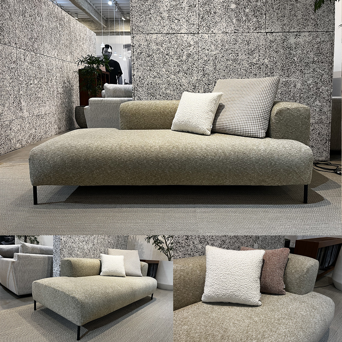 天然繊維のようなスラブ調の糸にひと手間を加えることで、生地に丸みを帯びたやわらかな動きが生まれ、従来のモケット生地にはなかった新しい表情を実現しました。さらに、さりげない色のコントラストを添えることで、洗練されたナチュラル感を演出しました。