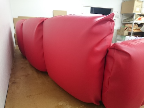 見た目のデザインが独特な、ご存じ、あのソファです。優しい色合いの生地より、合皮へのカバー交換となりました。お色は赤で雰囲気もガラッと変わり、また違った印象を愉しめますね。とくに合皮独特のシワなども出やすいですが、優しいラインはできるだけ崩さないようにいたしました。