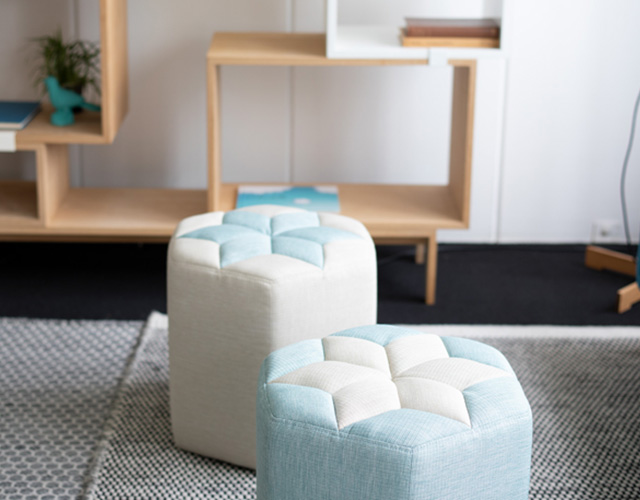 「poco」は見た目の可愛らしさは想像がつかないほど、手の凝った幾何学模様のデザインがアクセントとなっております。まず座面はオットマンということで硬いものを想像しがちですが、ソファ専門店の技術を駆使しウレタンを3層に重ねることで弾力のある座り心地となっています。阿部は、この幾何学模様のデザインに仕上げる為に幾度となく、デッサンやひし型の布の試作を重ね、座クッションの幾何学模様部分の適度な優しい膨らみを造りあげること、立体的に見せるために座クッションの内側に25本の紐を通しての引き込み作業に悪銭苦闘しながらも、理想的な膨らみと座り心地を実現しました。また淡いカラーの生地は優しい印象を与えると同時に可愛らしい色合いにも飽きのこない魅力が詰まっています。