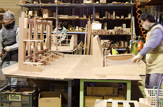 NewSugar Hi-Back ModernやCervoなどの木枠を製作いただいている木材ウッドテクノ様の工場にご訪問させていただきました。右のお写真では左がCervo X5、右の木枠がNewSugarStandardの木枠です。木枠の工程は全てボンドとタッカーにて作業されており、強度が必要なところはカポール・その他は合板を使用しています。