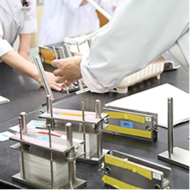 生地の組成を調べる混用率検査という検査があります。例えば、アクリル80%、コットン20%など主に布の組成を調べる検査ですね。日本では家庭用品品質表示法で定められているアイテムについて、何で作られているものなのか明記することが法律で決まっていますので、その糸が何で作られているものなのか検査することもこちらの機関で行っています。海外では生地メーカーが用意している生地でさえその生地が一体何の繊維で織られているかわからない危険なケースもあるそうですが、確実により分ける方法を用いて検査をしていきます。小さなお子様やアレルギーなどお困りのお客様も多いことから、このような試験があることで私たちの生活を手助けしてくれていることがわかり、100%間違い無いものが商品として提供出来ることは我々も安心し、自信を持った案内に繋げられると思いました。