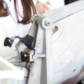 今回は生地に関する試験をメインに見学することができました。まず、はじめに色変化を見る検査から拝見しましたが、人工的に汗を作り色褪せや色移りの試験をされておりました。入念にチェックをする行程ですが、検査というとジッと机で研究をするかのような印象でしたが、白衣をまとったスタッフの方が生地に溶剤をつけたり、機械から乾燥した試験物を取り出しチェックしたりと次から次への動き回ることで別の工場に来て御菓子の製造工程を見ているような気になりました。