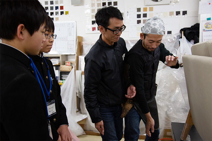 午後のクッション入れ体験が終了し、本体に置く様にクッションを置いて見た時には、ソファの形になったクッションの姿に、シャイな彼らも「おー!」っと声を出し頷きながら納得していました。どんな仕事も初めは難しく、先が見えないものですが、真剣にその仕事と向き合い努力を積み重ねていくと、いつかは形が見えてきて、やりがいに変わっていく。そんな事を職場体験を通して、ほんの少しでも味わってもらえたなら嬉しいなと思います。